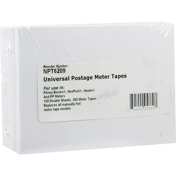 With NuPost postage meter tape, find significant savings on postage labels that are compatible with Pitney Bowes, NeoPost, Hasler, FP or other manually fed meter tape models. NuPost meter tape is 100 percent compatible with the Pitney Bowes DM100i, DM200L, E700, E707, K700, Mailstation and P700 hardware. Each order comes with one pack of 150 sheets of postage meter labels. The NuPost meter tape offers you quality, reliability and consistency in the office. Each sheet holds two labels for a total of 300 labels per order.