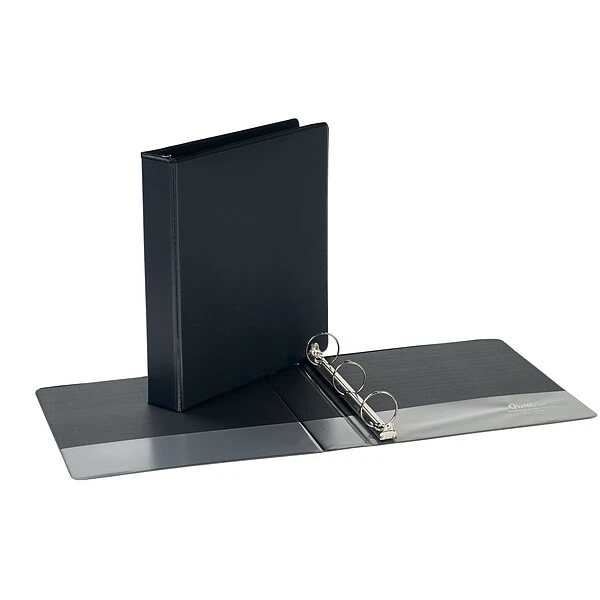 Clear overlay for customization on all three sides. PVC-free, non-stick material will not damage contents. Clear pockets on the inside front and back covers are ideal for storing loose documents. Back mounted round rings provide a cleaner look. Holds 8 -1/2″ x 11″ sheets. 1.5″. Black. 350 sheet capacity. 6 per pack