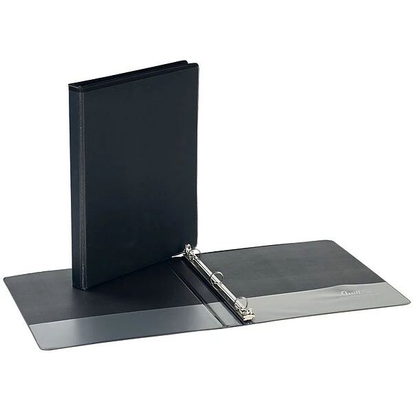 Clear overlay for customization on all three sides. PVC-free, non-stick material will not damage contents. Clear pockets on the inside front and back covers are ideal for storing loose documents. Back mounted round rings provide a cleaner look. Holds 8 -1/2″ x 11″ sheets. 1/2″. Black. 125 sheet capacity. 6 binders per pack.