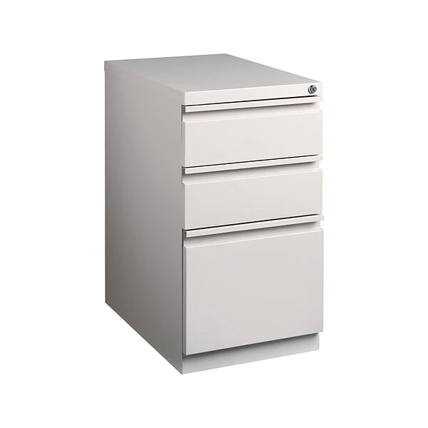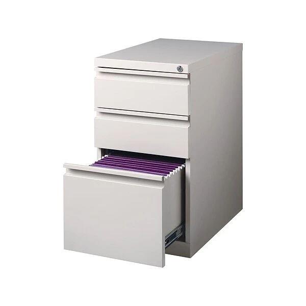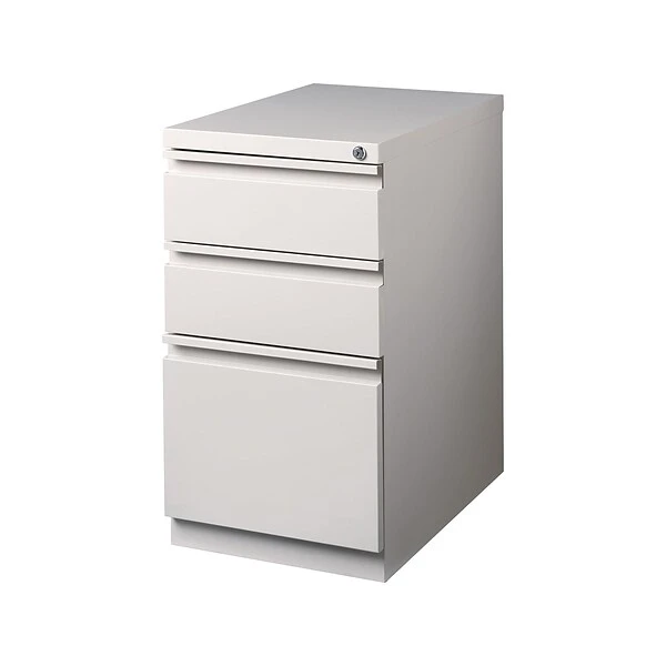 Bring extra storage to your workspace with this putty file cabinet. Hidden casters make it easy to roll this pedestal across your office floors, while the compact size fits neatly under a desk or another small space. Two box drawers offer convenient storage for office supplies and other items, keeping clutter off your desk. Use the file drawer to keep paperwork organized and accessible. Featuring a factory-installed core removable lock, this mobile file cabinet keeps valuables and sensitive documents secure.