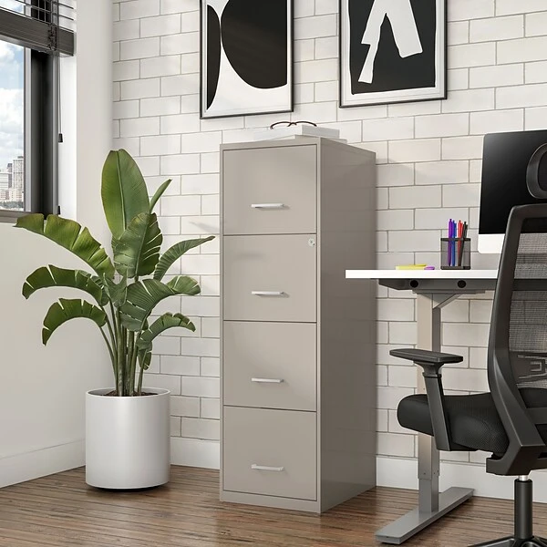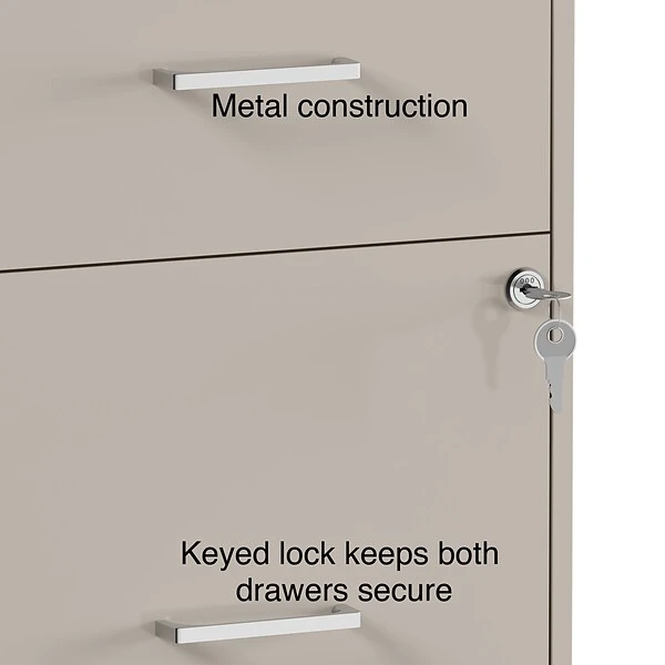 Organize your home or small office with the 4-Drawer light duty vertical file cabinet. Keep all your letter-sized documents secure and tucked away in four 18” depth drawers. This file cabinet comes equipped with one factory installed lock and key, controlling both drawers for peace of mind and security. The sleek putty finish and polished handles keep your office space looking contemporary and organized. This cabinet is backed by a 7-year limited warranty, keeping you satisfied for years to come.
