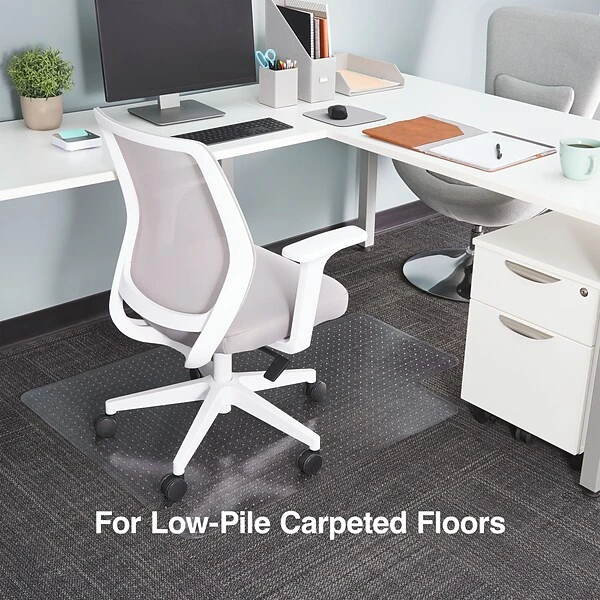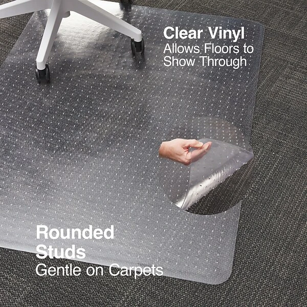 Extend the life of your low pile carpet (up to 3/8″ thick including padding depth) by protecting against chair caster wear and tear. The perfect addition to your workspace, this chair mat provides a smooth surface that enhances ergonomic comfort by allowing your rolling office chair to move freely. Easy to handle, this chair mat features rounded AnchorBar cleats (studs) that hold your mat in place and are gentle on carpets and fingers (no sharp spikes). This chair mat is made with durable vinyl that is GREENGUARD Gold Certified for low chemical emissions to promote a healthier workspace. Designed for use on carpeted surfaces only, do not use on hard floors.