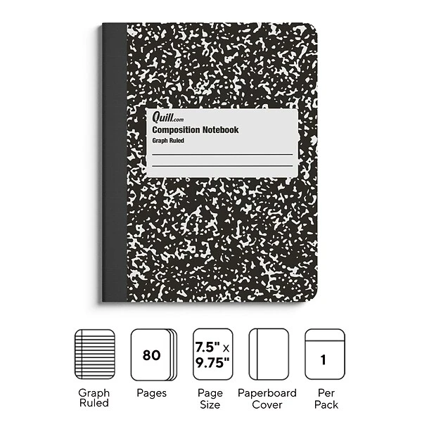 Stock your desk with this graph-ruled composition notebook. Each sheet is printed with a 5 x 5 quadrille rule on both sides, so there’s plenty of room to work with, while the hardcover and sturdy heavyweight boards provide durability and a stable writing surface. This Quill Brand Business Essentials 7.5 x 9.75-inch black and white graph-ruled composition notebook is center-sewn, eliminating page loss.