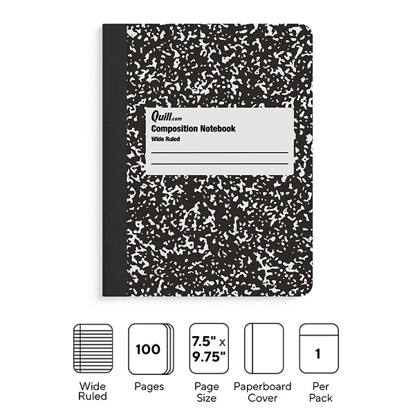 Carry this composition notebook in a briefcase or backpack for quick access to notes. With 100 pages, there’s plenty of room for all your ideas, poems, doodles and notes, while the wide-ruled spacing lets you write with larger letters. This Quill Brand Business Essentials 7.5 x 9.75-inch black and white wide-ruled composition notebook is a perfect size for taking on the go.