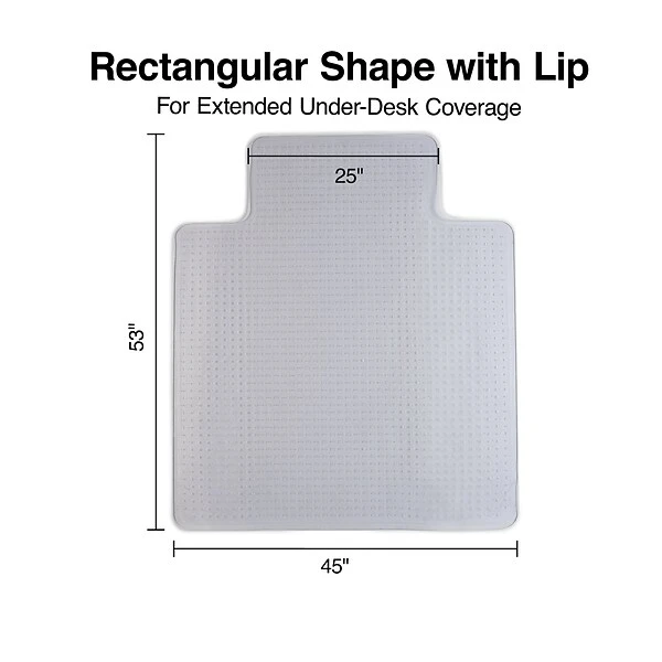 - Lip shape for extended under desk coverage, 45″W x 53″L