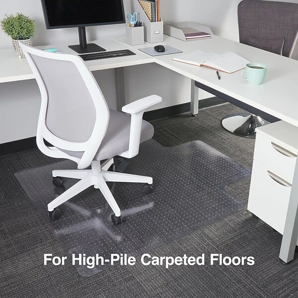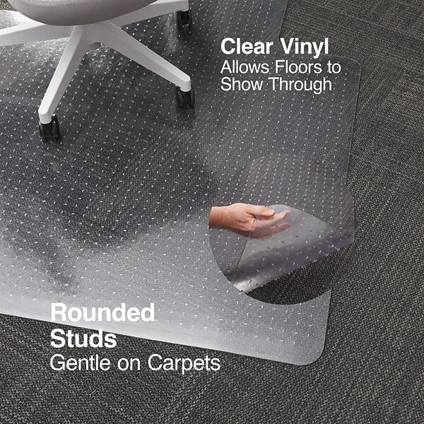 Extend the life of your high pile carpet (up to 1″ thick including padding depth) by protecting against chair caster wear and tear. The perfect addition to your workspace, this chair mat provides a smooth surface that enhances ergonomic comfort by allowing your rolling office chair to move freely. Easy to handle, this chair mat features rounded AnchorBar cleats (studs) that hold your mat in place and are gentle on carpets and fingers (no sharp spikes). This chair mat is made with durable vinyl that is GREENGUARD Gold Certified for low chemical emissions to promote a healthier workspace. Designed for use on carpeted surfaces only, do not use on hard floors.