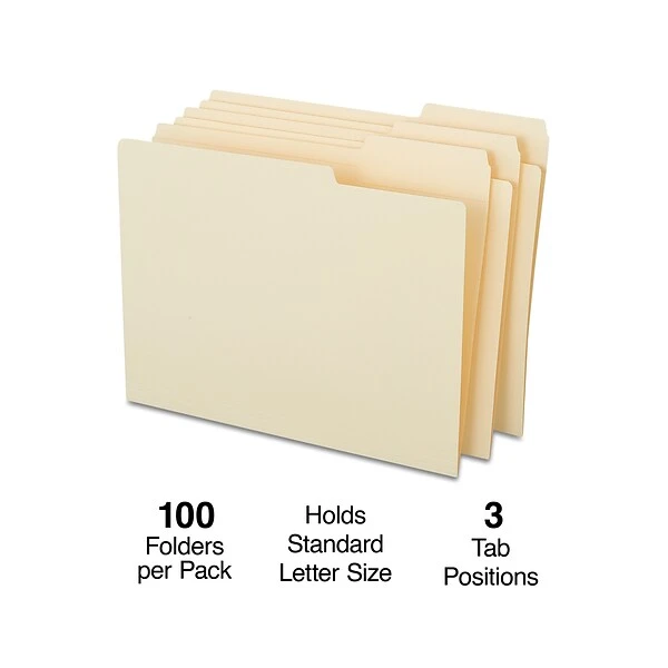 Made from sturdy 180-pound stock in a classic manila hue, these folders not only present a professional image but also hold up well in a busy workplace. Each folder can expand up to 3/4-inch for medium and large files, and the 2-ply tab is strong enough to withstand frequent handling, making the folders a good choice for organizing accounts, records and blank forms.
