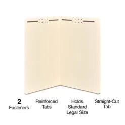 Designed to expand 0.75 inch, these folders are roomy enough to store depositions, contracts and background information. A straight cut across the top of the folder provides plenty of space for the client’s name and other information. With bulky files in mind, the fasteners measure a generous 2 inches to accommodate a large file.