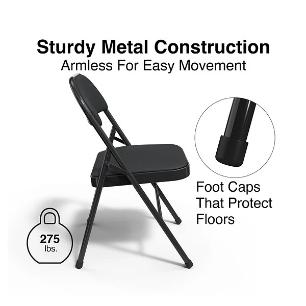 Set up a flexible seating area with this metal folding chair. The lightly-padded seat and seat back offer added comfort, while the Luxura upholstery offers an upscale appearance. A sturdy metal frame offers durability for all-day use, providing an ideal option for use in business meetings, parties, or other special events. This black folding chair folds flat for easy storage, so it tucks away neatly in a closet or storeroom.