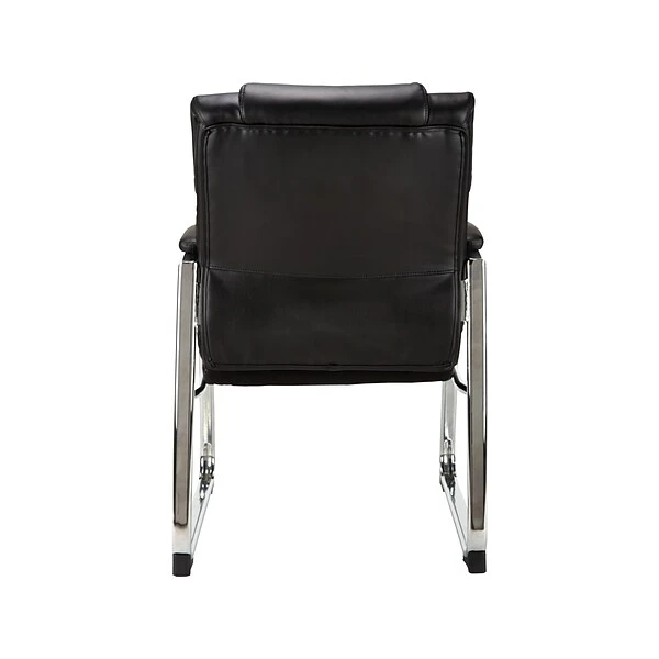 Create a warm, welcoming seating area for visitors to your building with this bonded leather guest chair. Contoured, segmented padding throughout the seat and seat back offer plush comfort, while the curved, padded armrests offer upper body support. This chair boasts bonded leather upholstery, providing both durability and sleek style. A sled-style base keeps this guest chair stable on a wide range of flooring surfaces, while the integrated floor glides prevent scratches and scuffs. With polished chrome accents and a sleek silhouette, this Sonada guest chair brings an upscale modern look to your private office, reception area, or lobby.