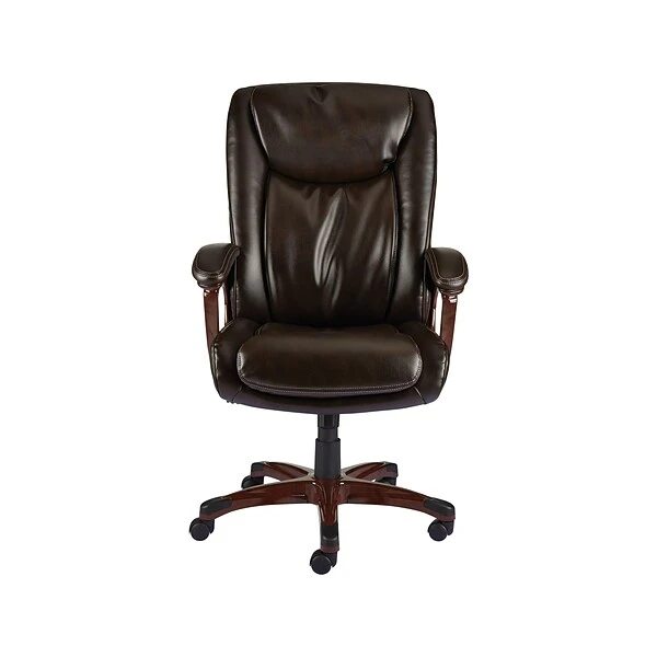 Set the tone of business with this handsome Westcliffe bonded leather manager’s chair. With brown bonded leather and matching wood-like accents, this executive armchair elevates the stature of the manager’s office. The upholstered back delivers extra cushioning, built-in lumbar support and padded elbow rests offer a comfortable seat. The back offers further accommodation with tilt tension for individualizing your preferred reclining pressure, while the tilt-lock setting lets you dial in your own reclining angle. The seat height is fully adjustable for optimal positioning. With a swivel feature and five casters on a wide, stable base, this Westcliffe bonded leather manager’s chair lets you pivot effortlessly between workstations.