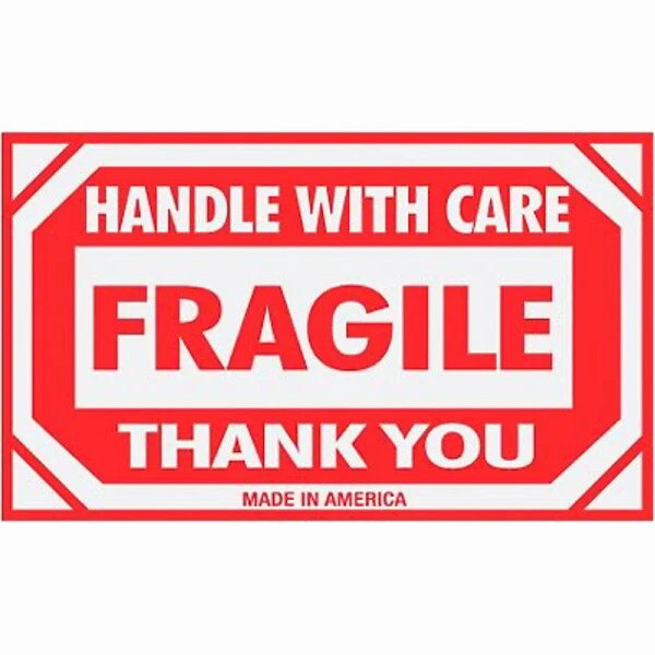 Self-adhesive “HANDLE WITH CARE FRAGILE THANK” labels for international box packaging and pallet shipping. See Product Details chart for more information.